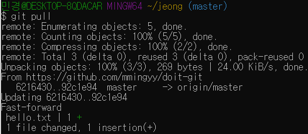지역저장소 jeong 입장에서는 원격저장소 doit-git이 초기에 복제했던 상태와 달라졌습니다.