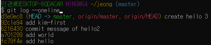 다시 jeong의 git log를 확인해보면 다음과 같이 create hello 3에 HEAD->master, origin/master가 가리키는 것을 알 수 있습니다.