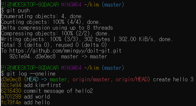 그리고 아직 push하지 않았으므로 원격저장소의 최종 커밋은 여전히 'add kim-first'임을 알 수 있습니다.