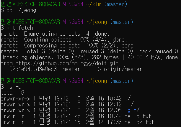jeong디렉터리로 이동 후 $ git fetch 명령어로 원격저장소 doit-git에서 가져옵니다.