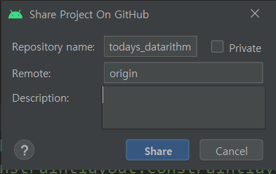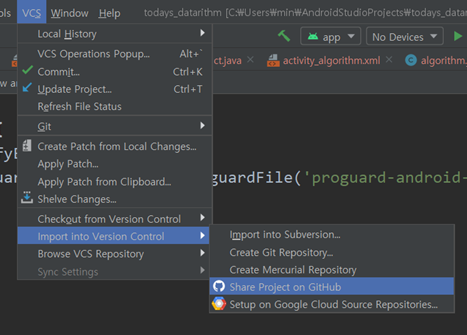 Import Into Version Control -> Share Project on GitHub 클릭