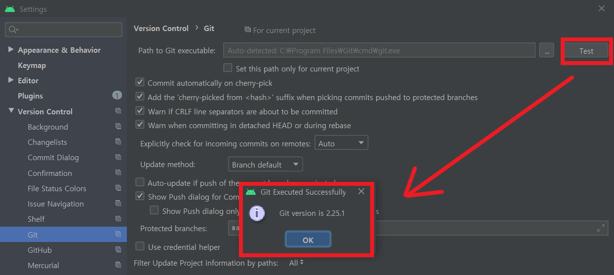 Version Control -> Git -> Test버튼