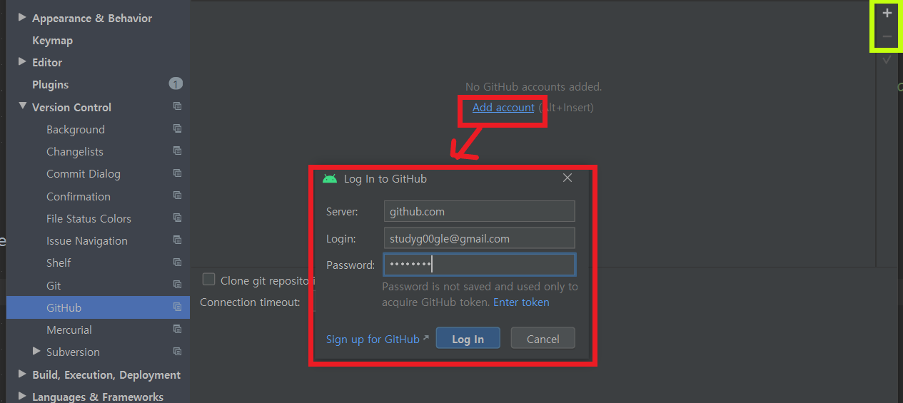 (기존계정은 초록 박스 안의 +와 -를 이용해서 추가/ 제거가 가능하다.)
