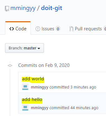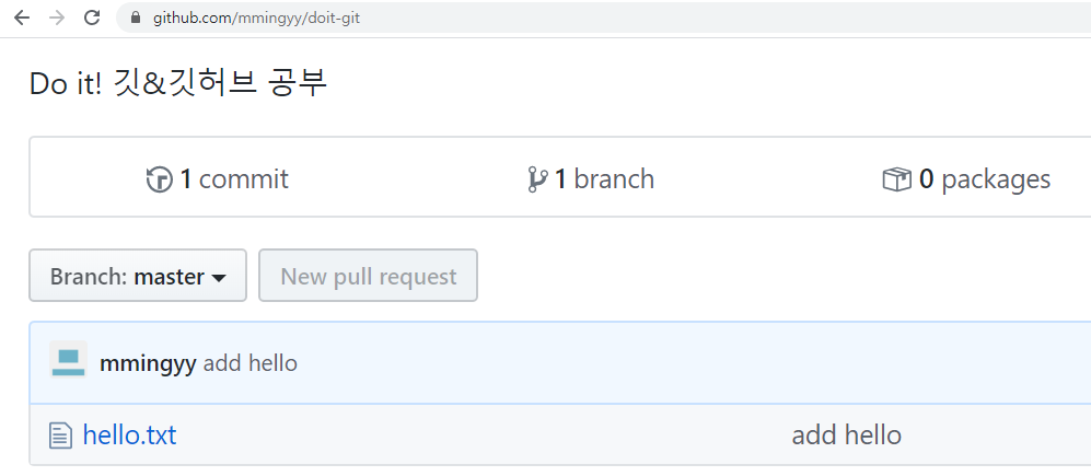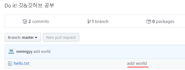 hello.txt가 올라간 것을 볼 수 있습니다. 옆에는 최신 커밋메시지인 add hello가 적혀있네요 :)