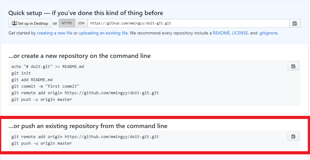 아까 만들었던 원격저장소에 들어가면 ...or push an existing repository from the command line(커맨드라인 이용)