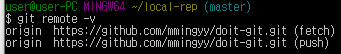 git remote명령어에 -v옵션을 붙이면 origin의 주소가 나타납니다.