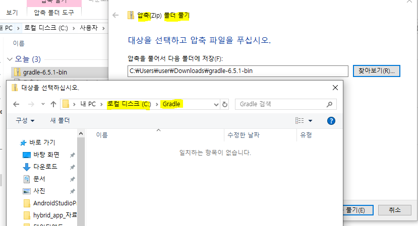 그리고 생성한 'Gradle'폴더에 다운받은 gradle-6.5.1-bin 파일을 압축풀기 합니다.