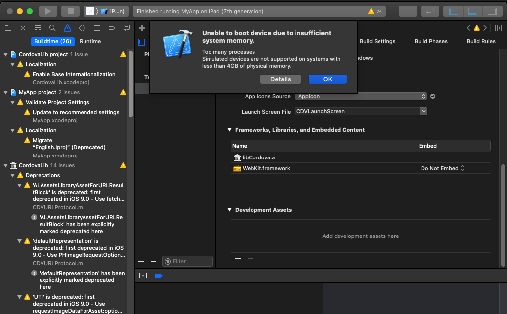 그랬더니 ios 시뮬레이터를 돌리려고 하니 다음과 같은 에러가 나타났습니다.