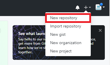 깃허브에 로그인 후 '+'버튼을 누르면 아래 사진과 같은 메뉴가 나타납니다.