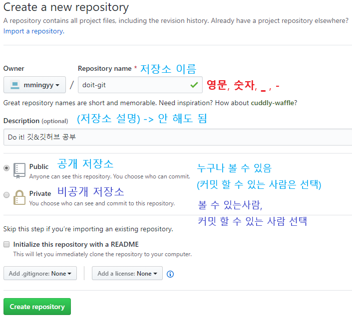 Initialize this repository with a README는 저장소 소개를 작성하는 readme파일을 기본으로 만들어준다는 뜻 입니다.