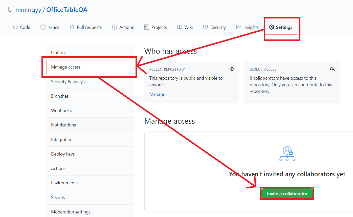 Settings -> Manage access -> Invite a collaborator -> 이메일/닉네임 입력해서 추가!