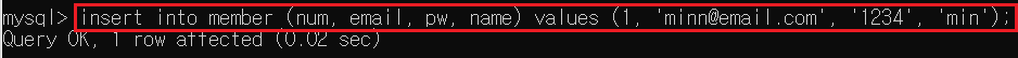 insert into 테이블명 (필드명1, 필드명2, ...) values (필드1값, 필드2값, ...);