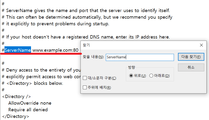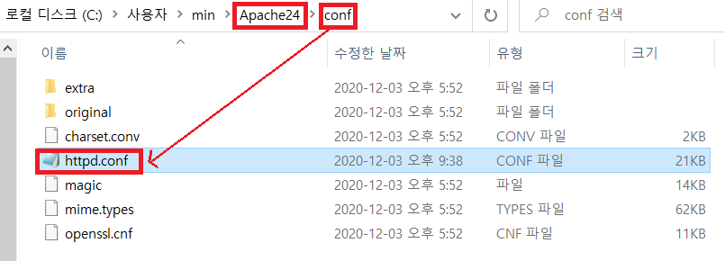 우선 apache24 \ conf 디렉토리의 httpd.conf 파일을 메모장으로 엽니다.