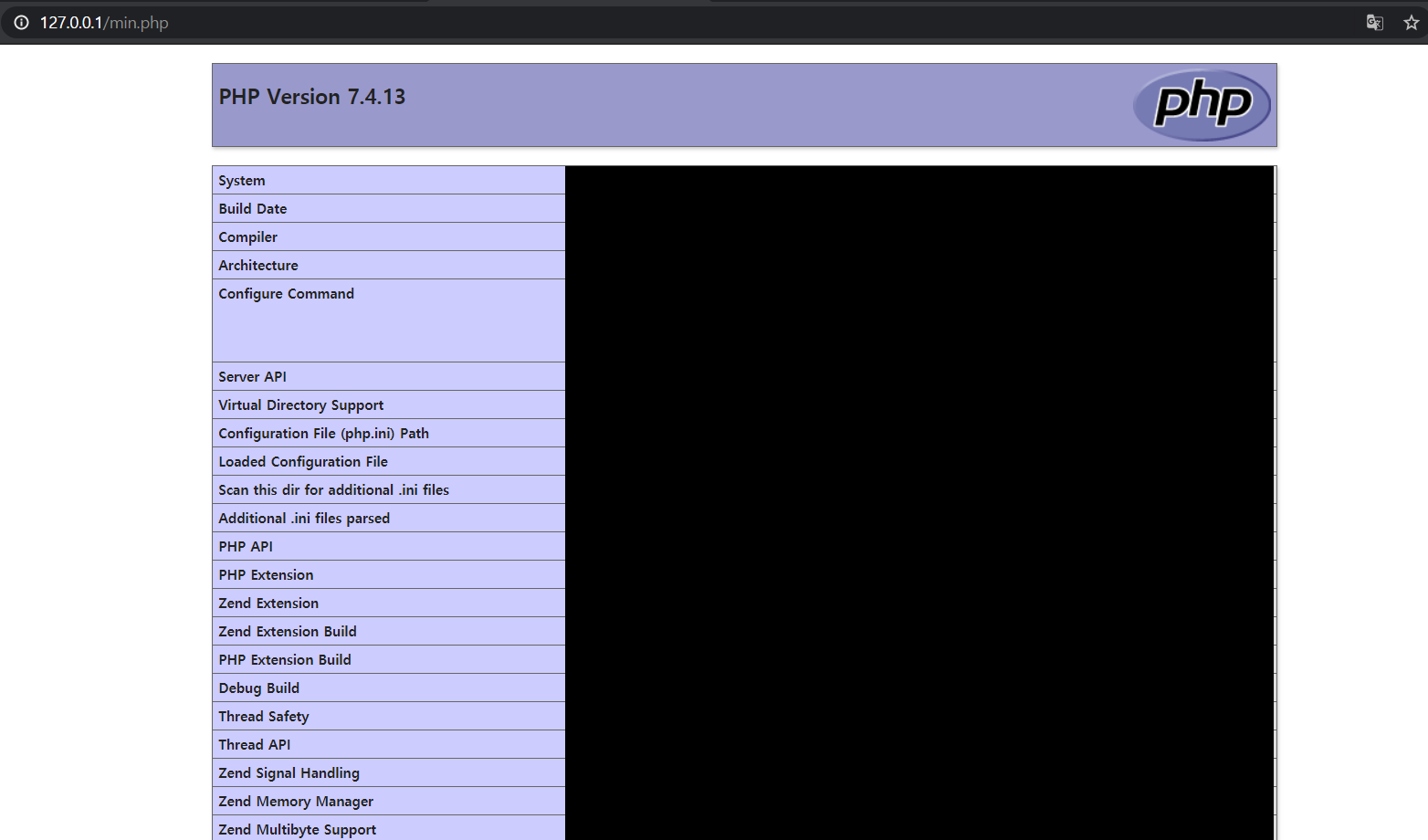 원래라면 127.0.0.1/min.php를 했을 때 phpinfo화면이 나타나야 하는데