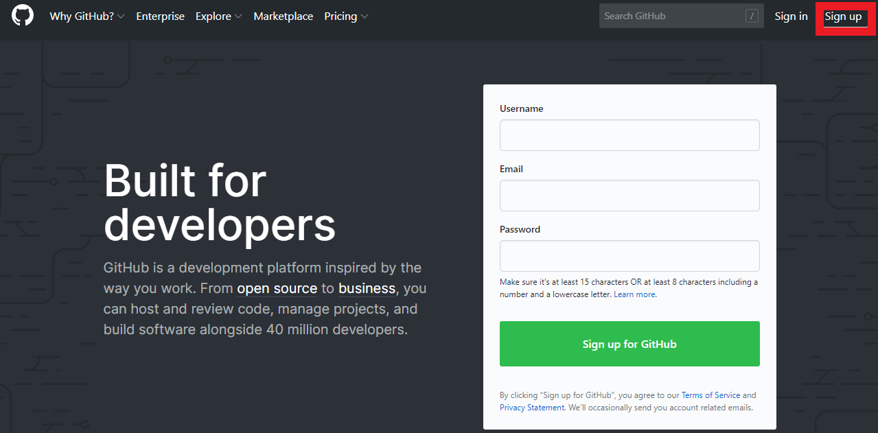 우선 깃허브에 접속한 후 'Sign up'버튼을 누릅니다.