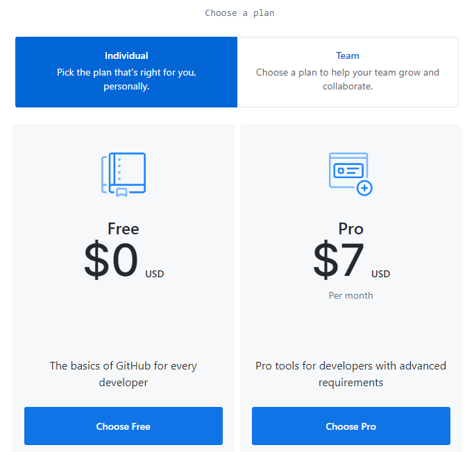 깃허브계정에는 무료(좌측)계정과 Pro(우측)계정이 있습니다.