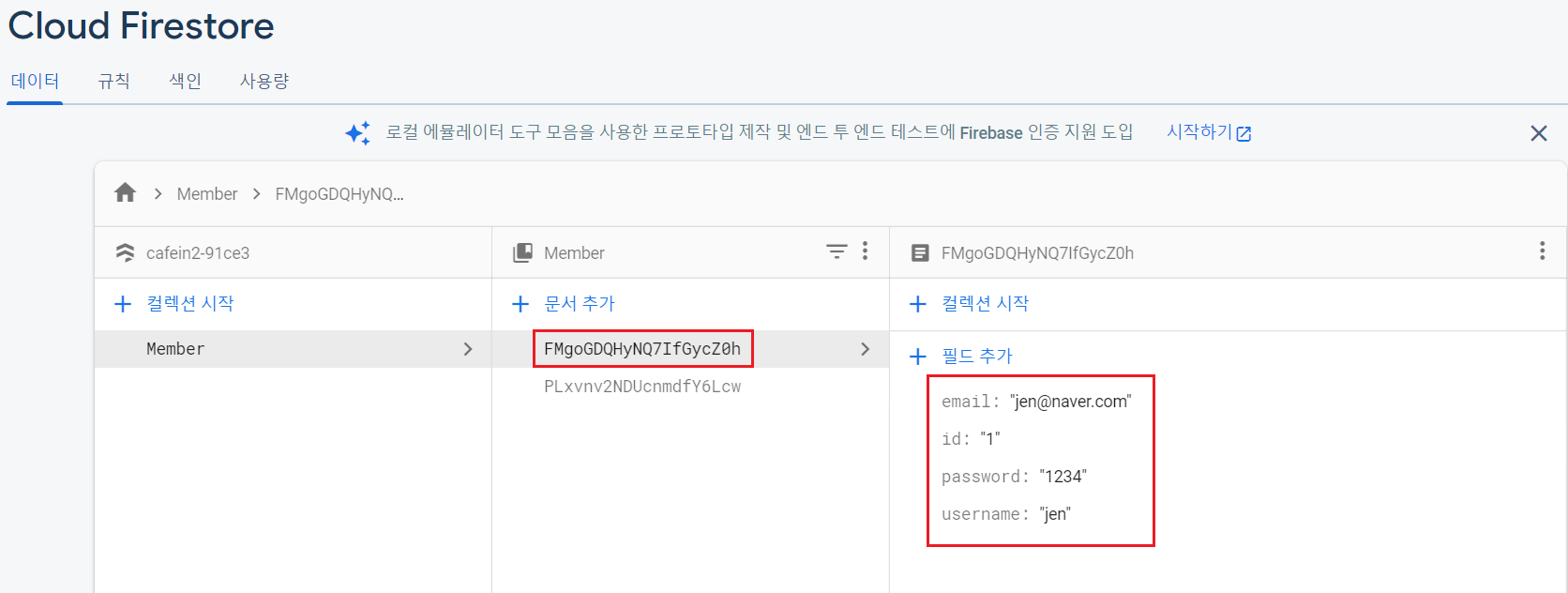 우선 파이어스토어에 다음과 같이 데이터를 넣는다.