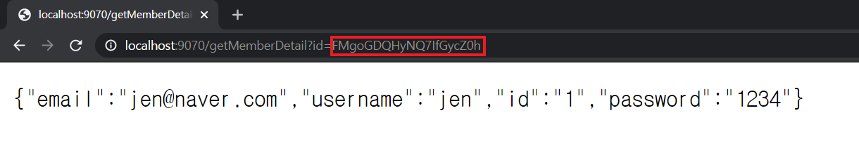※ 나의 경우 9070 port를 이용했다. ( http://localhost:9070/getMemberDetail?id=FMgoGDQHyNQ7IfGycZ0h )
